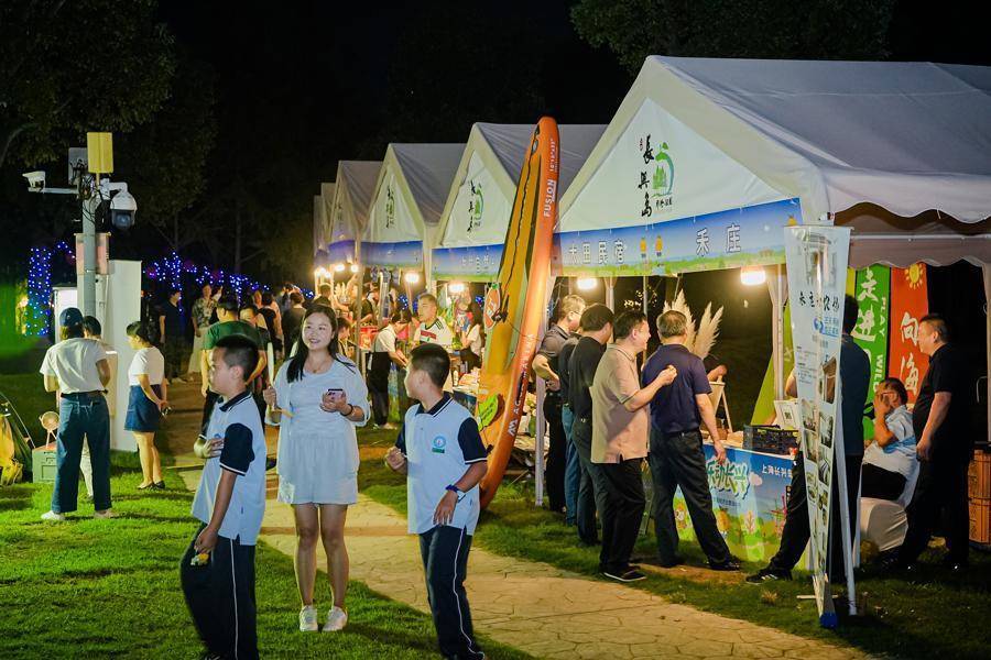 活动现场,乡村市集人头攒动,长兴镇优质民宿、农业企业及合作社、文创研学团队、民间手艺工匠等各类特色摊位提供现场订购、试吃服务,并拿出诚意满满的优惠福利。走进公园,两侧布满菊花景观的道路上游人如织,以长兴镇特色IP“橘宝”为形象的气模人气火爆,阳光可爱的外表引得民众纷纷拍照打卡。夜幕降临,长兴镇风味美食集市炊烟袅袅,一道道特色佳肴香气四溢,构成一幅充满烟火气的乡村夜生活画卷。融合长兴元素的首批原创产品也亮相文创摊位,在年轻群体中备受青睐。“在地化+品质化”的夜间消费场景设计,不仅丰富了游客夜间体验,也切实带动了本地商户增收,让消费红利真正惠及乡村肌理。